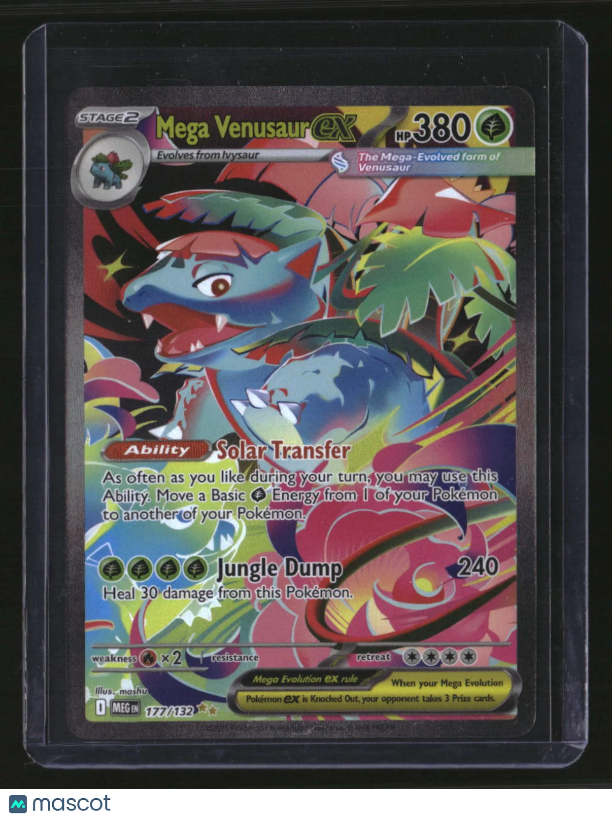 his is a nice example of a ME01: Mega Evolution #177/132 Mega Venusaur ex Holo. Please check out our other listings for more great cards. Thank you for your interest in one of our cards!!! Prior to making any bids/purchases, I would kindly ask you to read the information below: Item Condition Please see the provided pictures for the condition of the card or item, pictures of the front and back are provided for your review. We cannot accommodate requests for additional pictures. Any notable flaws or damage to this item will be noted in this listing. Please use the attached photos provided for your own assessment. Graded card cases may come with some minor wear/tear, surface scratch, chipped, or blemish. There are no partial refunds or returns because of the case condition. All single cards will come in protective cases. If you purchase a listing that’s sold as a lot it may come in snap cases or sealed in a team bag, and not all cards will be individually sleeved and top loaded in all lots. Raw cards are sold as such, with no guarantees of potential and/or expected grades. All cards are sold as is, with no returns or refunds. Listed With Mascot.