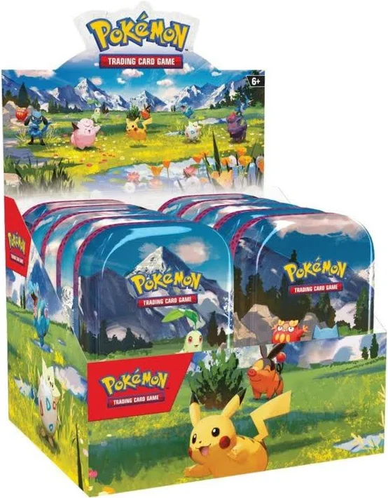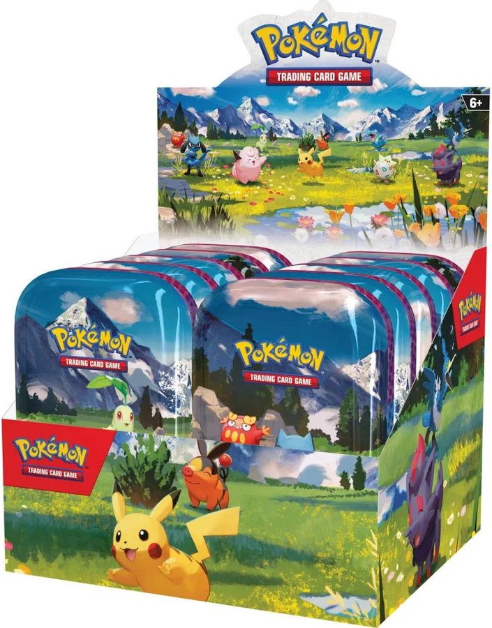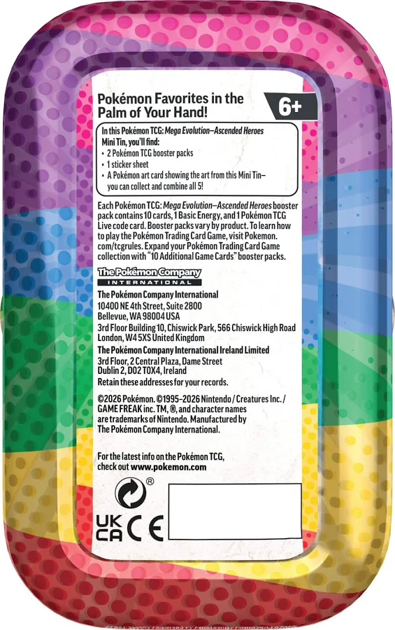 Pokémon Favorites in the Palm of Your Hand! In this Pokémon TCG: Mega Evolution—Ascended Heroes Mini Tin, you’ll find booster packs, sticker sheet, and a Pokémon art card showing the art from this Mini Tin—you can collect and combine all 5!